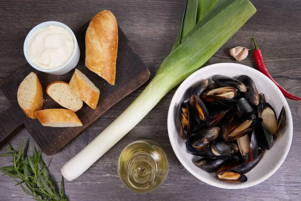 In una pentola profonda versare il vino bianco e aggiungere le cozze. Cuocere a fuoco medio, con il coperchio, fino a quando iniziano ad aprirsi. Togliere dal fuoco e conservare solo uno dei gusci.