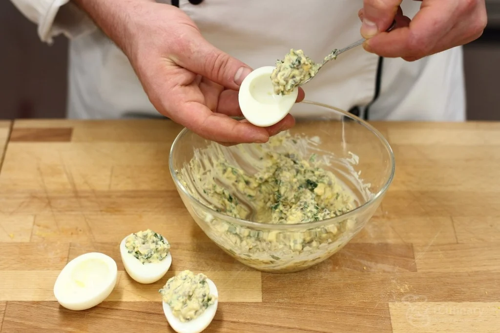 1. Lessare le uova per 10 minuti, sbucciarle e tagliarle a metà. Rimuovere i tuorli.