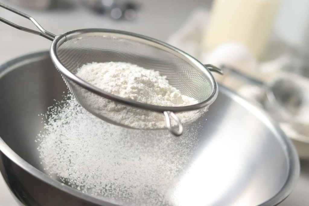• Setacciare gli ingredienti secchi e metterli da parte. Ricordate che quando setacciamo la farina integrale, lo scopo è quello di arieggiarla e smuovere eventuali grumi. Pertanto, la fibra che rimane nel setaccio deve essere rimessa nell’impasto. Non eliminate l’unica cosa nobile che questa farina ha, per favore!