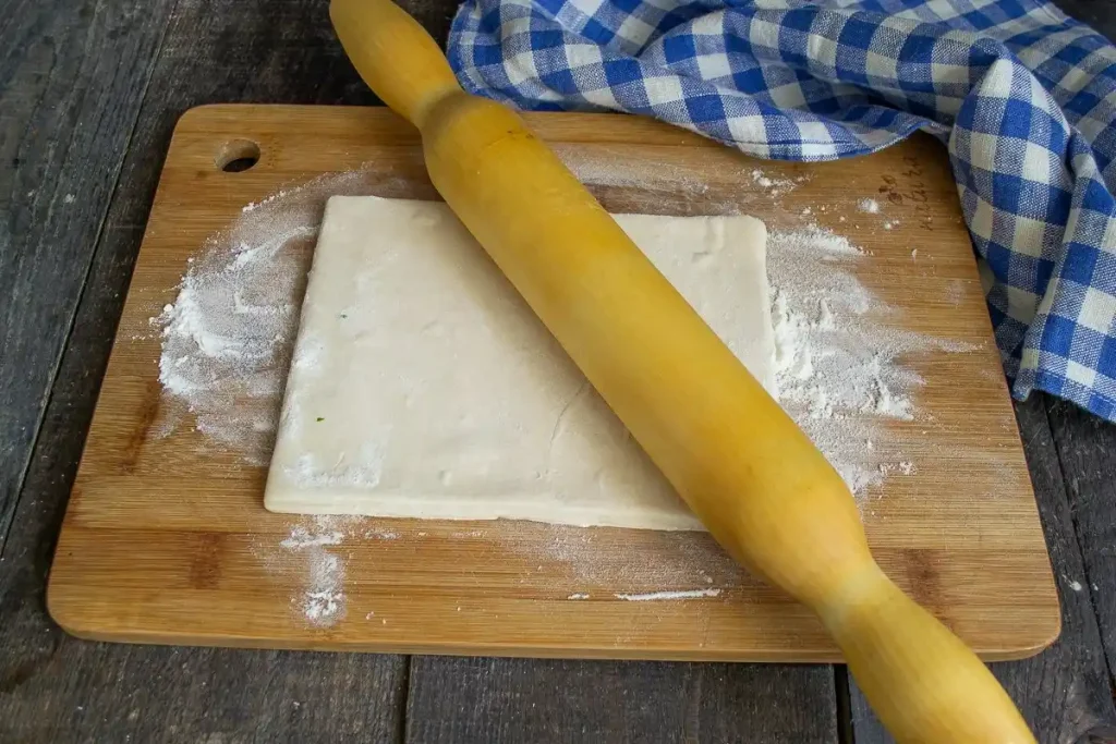 Quindi, stendiamo la pasta sfoglia su una teglia rivestita con carta da forno. Distribuisci il composto di sardine su tutta la superficie e pungi la pasta in diversi punti in modo che non si gonfi troppo.