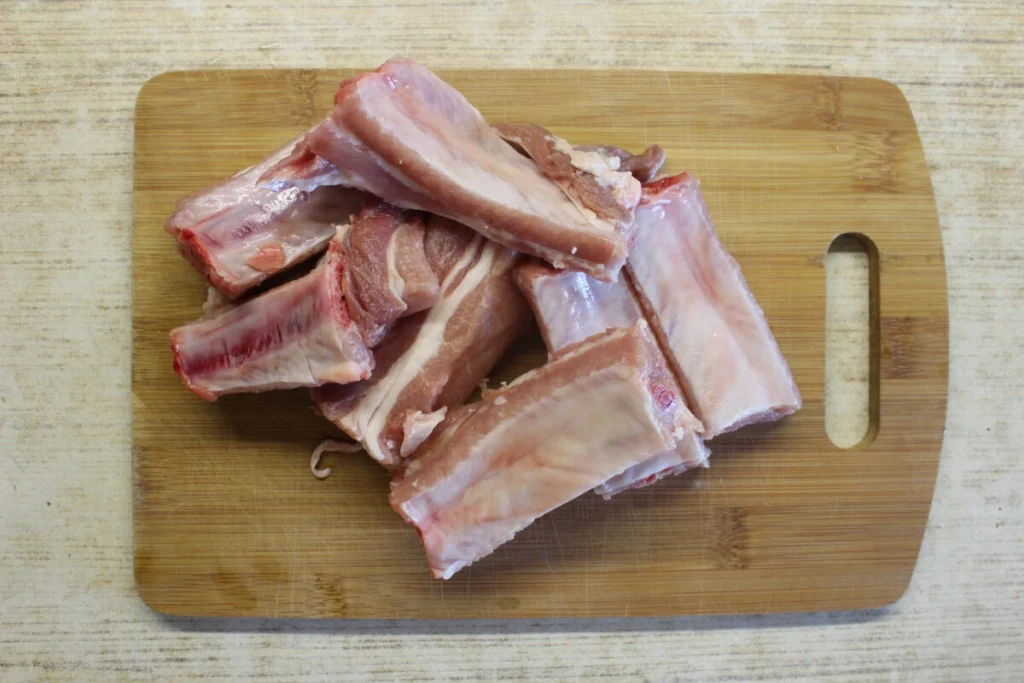 1. Pulite le costine di maiale e tagliatele lungo l’osso. Condite con sale e pepe. Lasciate marinare per circa dieci minuti.