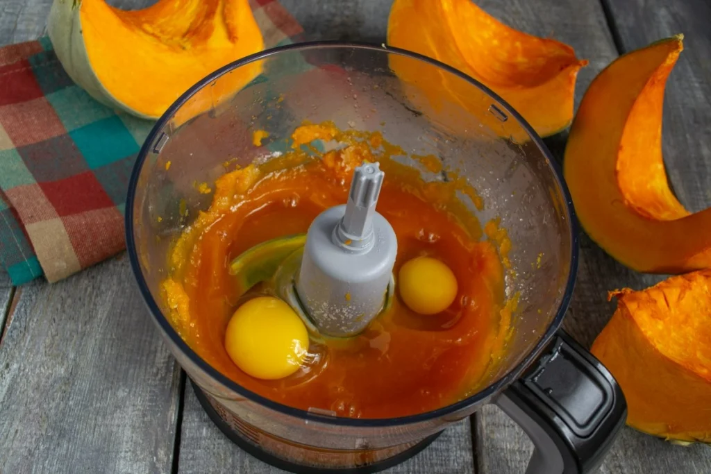 In un bicchiere mettiamo la zucca già cotta e tagliata a cubetti, la farina di mandorle. Aggiungiamo poi le uova, i datteri snocciolati, il lievito e frulliamo bene il tutto fino a ottenere una consistenza il più omogenea possibile.