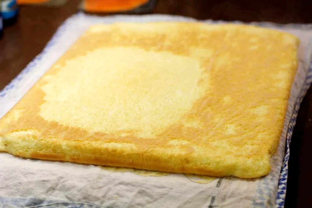 • Una volta terminata la cottura, stendere un panno di cotone pulito o una carta da forno pulita, capovolgere la teglia con il pan di spagna sul panno, rimuovere con cura la carta da forno e arrotolare con cura o lasciarlo srotolato fino al momento dell’utilizzo. Se lo si lascia srotolato, coprirlo con carta da forno e pellicola trasparente per evitare che si secchi.