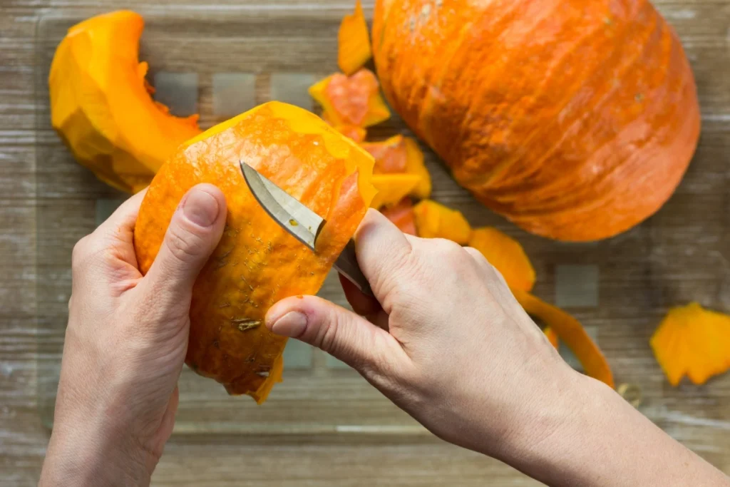 - Sbucciamo la zucca, togliamo i semi e la tagliamo a pezzi.