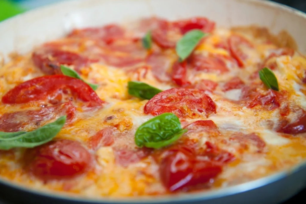 Sbattere 3 o 4 uova in una ciotola con sale e pepe. Taglia 2 pomodori medi a cubetti piccoli. Scolali un po’ se rilasciano molto liquido. Mescola i pomodori con le uova sbattute. Scalda un po’ d’olio in una padella antiaderente, versa il composto e cuoci a fuoco medio-basso. Quando si sarà rappreso sul fondo, giralo con cura e cuoci l’altro lato fino a quando non sarà dorato e ben cotto all’interno.