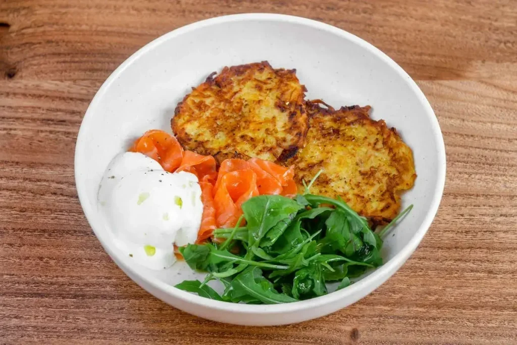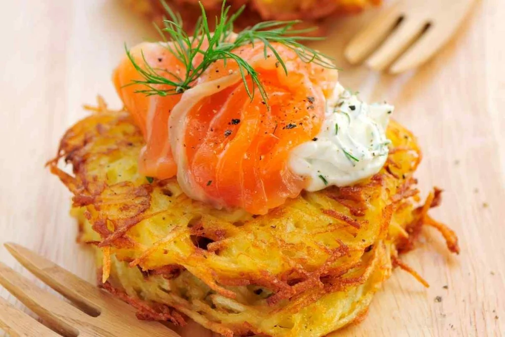 Le frittelle di patate con salmone e panna sono un contorno o uno snack da festa unico, perfetto anche per le occasioni più formali. Le frittelle calde e croccanti si sposano perfettamente con la panna fredda e cremosa e il salmone affumicato salato. Tutti si innamoreranno di questa combinazione di sapori e consistenze. Non si può inoltre trascurare il fatto che si tratta di un piatto che si prepara molto velocemente e, con l’aiuto di un robot da cucina per grattugiare le patate, ancora più velocemente.