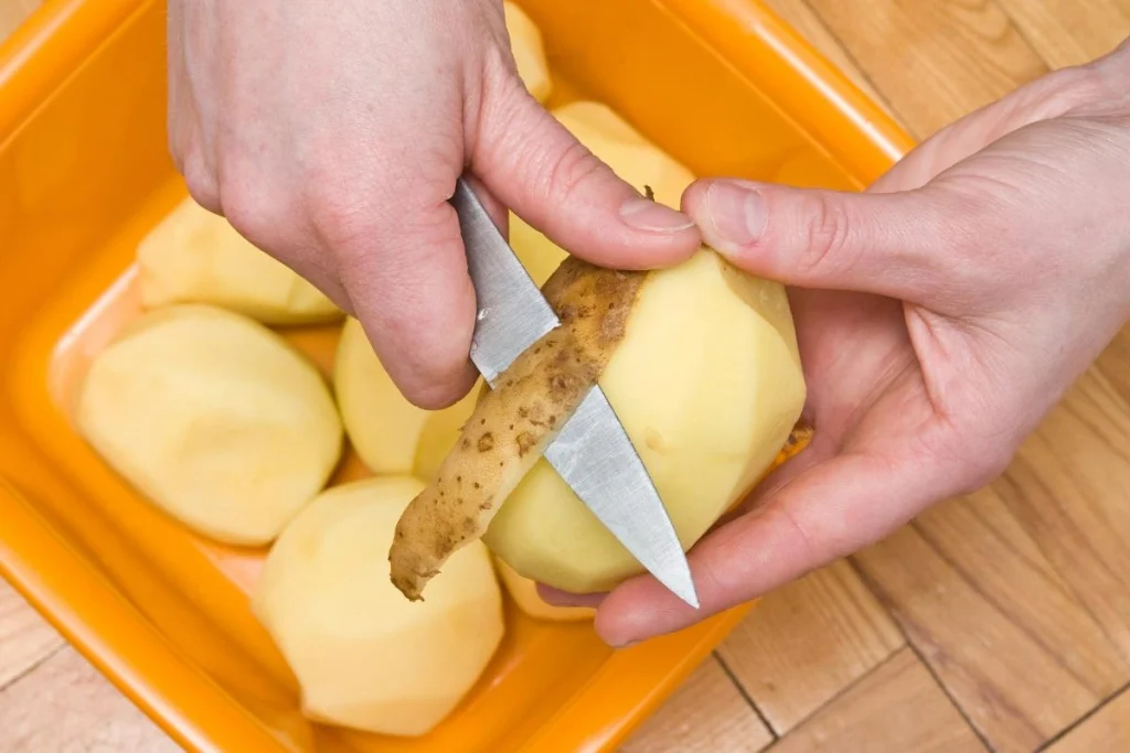 1. Sbucciamo e tagliamo le patate assicurandoci che abbiano tutte le stesse dimensioni. Le mettiamo a bagno in acqua e le mettiamo da parte.