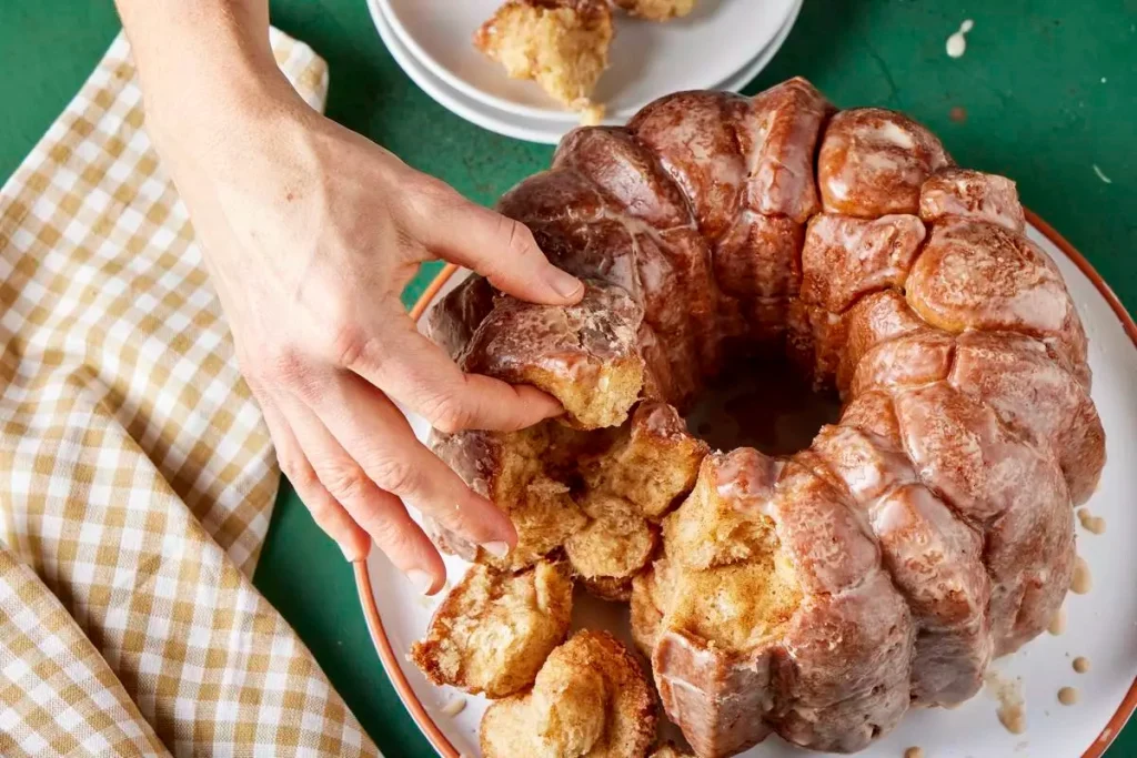 • Cuocete il monkey bread per 35 minuti o fino a quando la superficie è dorata e il caramello sui bordi bolle. Toglietelo dal forno e lasciatelo riposare per 10 minuti.