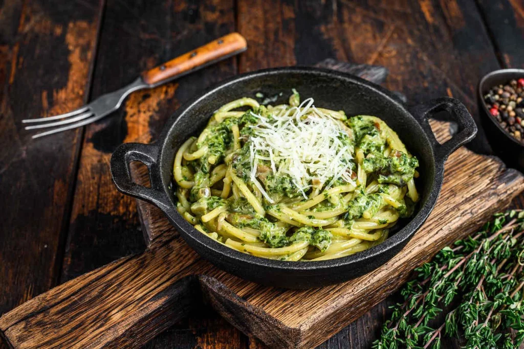 Invece di una salsa pesante, questo piatto ha una base leggera di olio d’oliva e aglio. Quando vengono riscaldati, i pomodorini rilasciano i loro succhi dolci e aciduli, creando una leggera emulsione che avvolge la pasta, mentre gli spinaci freschi vengono aggiunti per dare colore e nutrienti.